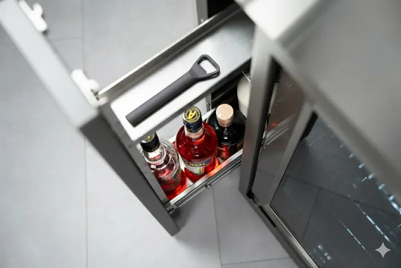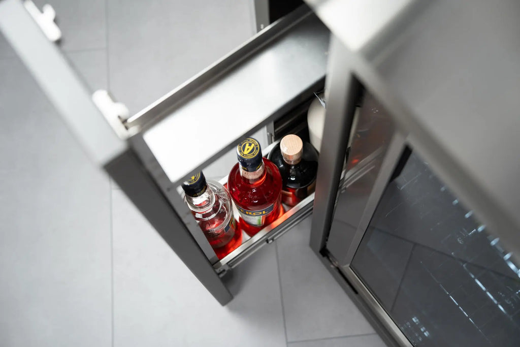 Den isolerade övre lådan rymmer fyra rostfria behållare som håller is, citrus, toppings och örter fräscha. Intill kylen finns ett utdragbart flaskskåp som gör det enkelt att förvara och hitta flaskor och tillbehör.