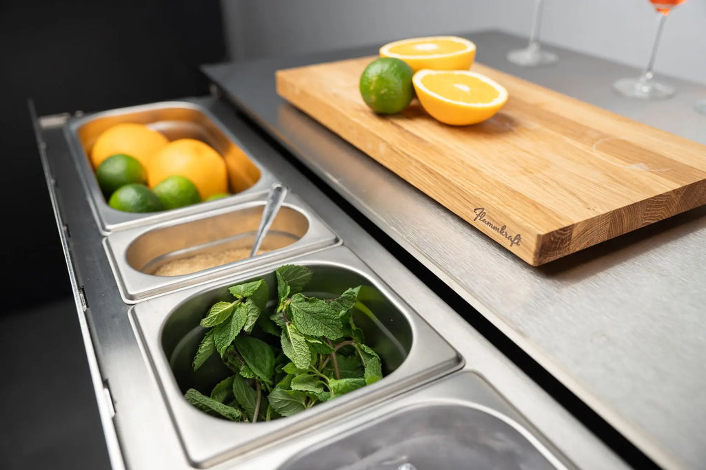 Med fyra rostfria behållare för is, citrus, örter och drinktillbehör.