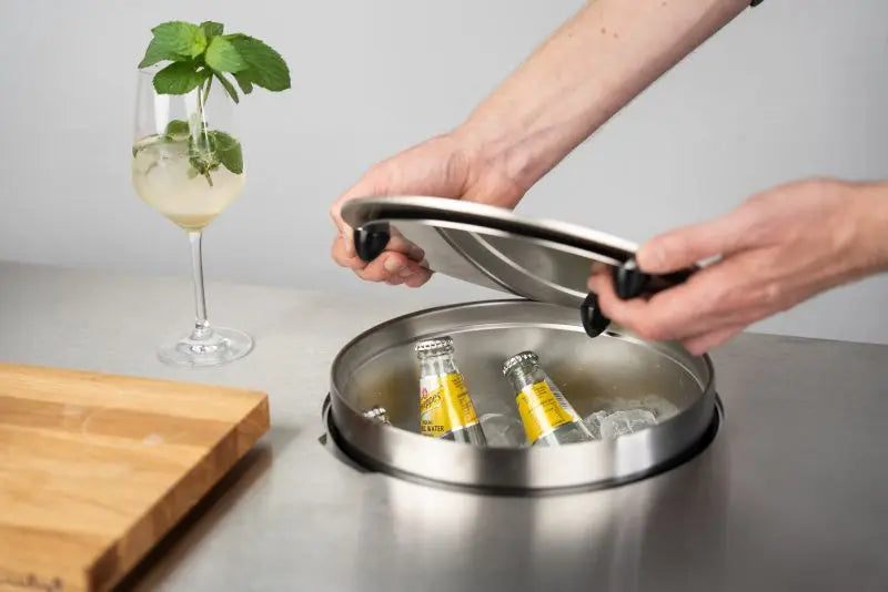 Den dubbelväggade vakuumisolerade iskylare i rostfritt stål kan placeras direkt i arbetsytans utskurna fack. När den inte används försvinner den ner i basen och arbetsytan förblir sluten och plan tack vare det massiva dubbelväggiga locket.