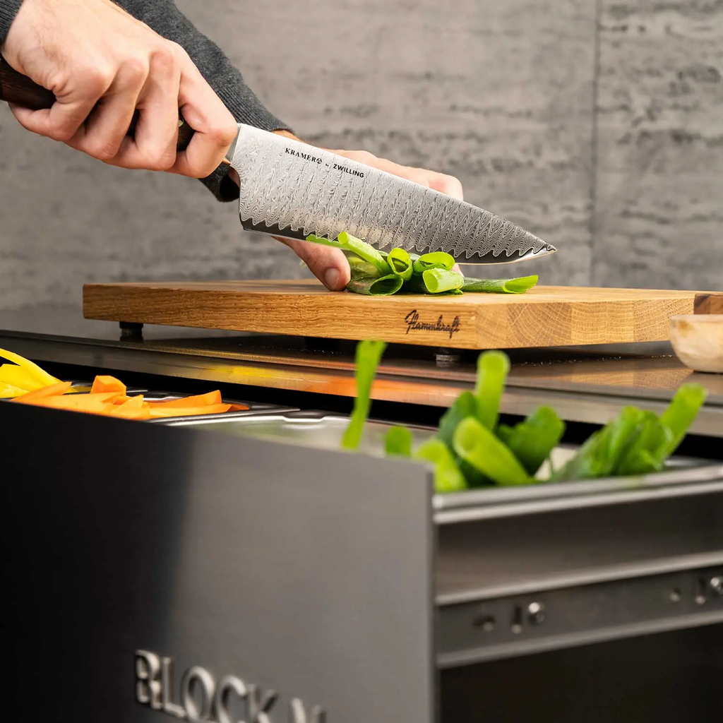 Brädan är precis anpassad för lådan i Block M och kan tack vare sina integrerade fötter enkelt skjutas över de inbyggda rostfria behållarna. Detta gör matförberedelsen smidigare och mer organiserad.